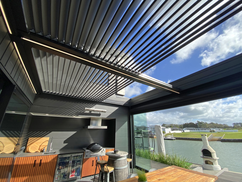Custom made in NZ, the roof can be fixed onto virtually all styles and shapes of homes and can be configured in Wall mounted, Freestanding and Integrated roof options. Features include the ability to partially tilt and retract louvres blades to control light and airflow, to retract the roof up to 75% of the roof area or tightly close for weather protection.
